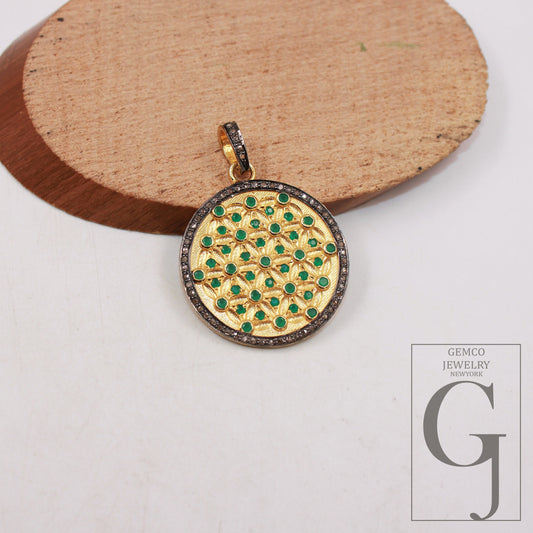 14k Vermeil Gold Emerald Pendant Designer Rosecut Pave Diamond Pendant 925 Sterling Silver Handmade Finish Diamond Pendant Charm Jewelry