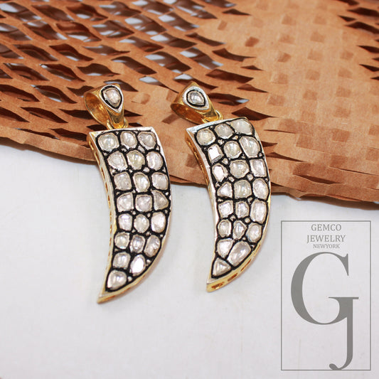 14k Gold Vermail Slice Neutral Diamond Horn Design Polki Pave Diamond Pendant 925 Sterling Silver Handmade Finish Flat Diamond Charm Jewelry