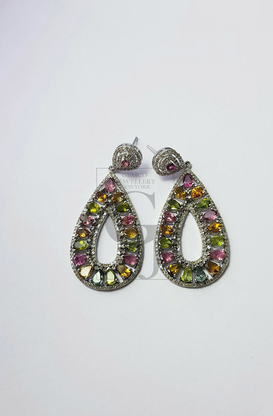 Tourmaline cut stone natural multi colored stone with rosecut pave diamonds sterling silver designer one of a kind earring