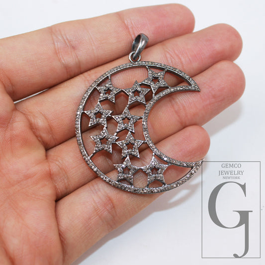 1pc Antique Crescent Moon Pendant Designer Rosecut Pave Diamond Pendant 925 Sterling Silver Handmade Finish Diamond Pendant Star Jewelry