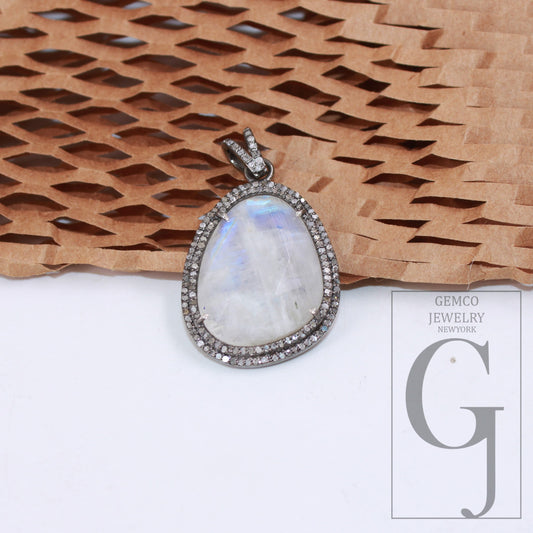 1pc Antique Look Rainbow Moonstone Pendant Rosecut Pave Diamond Pendant 925 Sterling Silver Handmade Finish Diamond Charms Necklace Pendant