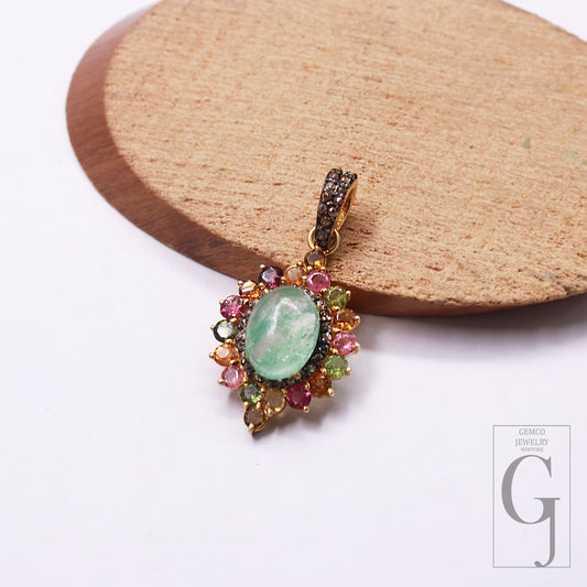 14K Gold Finish Multi Tourmaline and Emerald Pendant with Pavé Rosecut Diamonds | Handmade Luxury Sterling Silver Jewelry