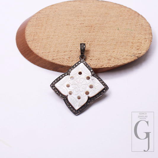 Flower Carving Pearl Stone & Pave Rosecut Diamond Pendant in 925 Silver