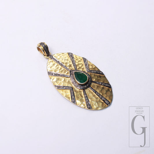 14K Gold Plated Shield Pendant with Emerald & Pavé Rosecut Diamonds | Handmade Sterling Silver Jewelry