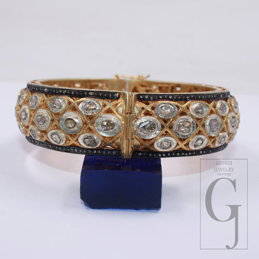 Antique Polki Diamond Bangle in 925 Sterling Silver with Rosecut Pave Diamonds