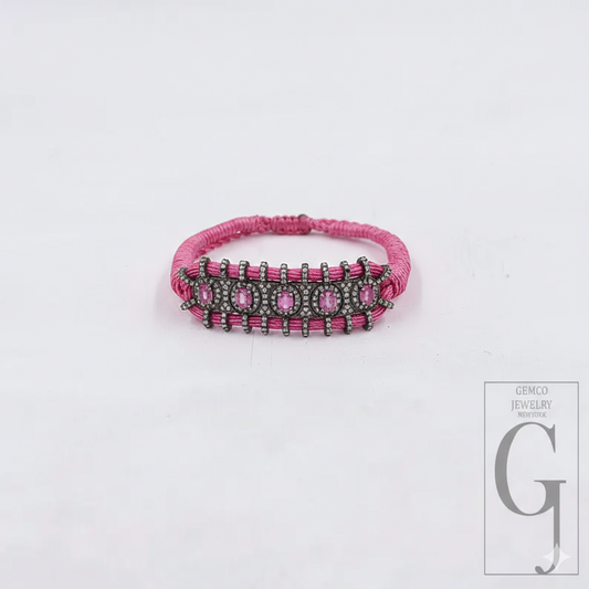 Designer Pink Macrame Bracelet – Pink Tourmaline With Pave Diamonds In 925 Sterling Silver