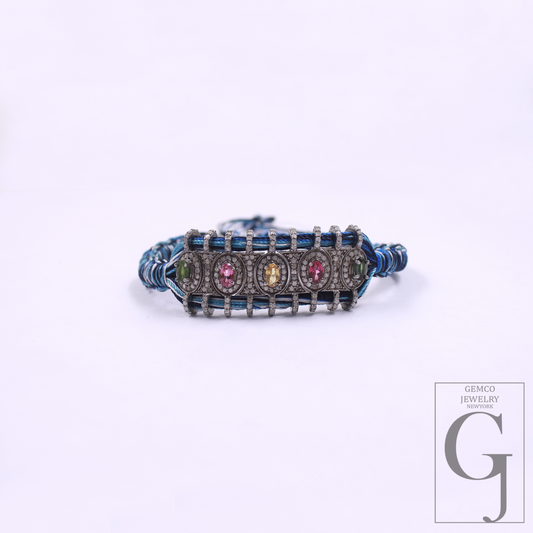 Natural Multi Tourmaline Thread Bracelet With Pave Diamonds In 925 Sterling Silver, Handmade Finish Adjustable Bracelet Gift For Her