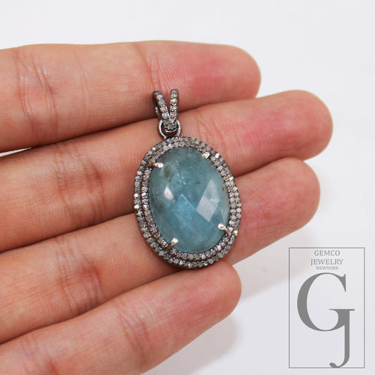 1pc Beautiful Designer Aquamarine Pendant Rosecut Pave Diamond Pendant 925 Sterling Silver Handmade Finish Diamond Charms Necklace Pendant