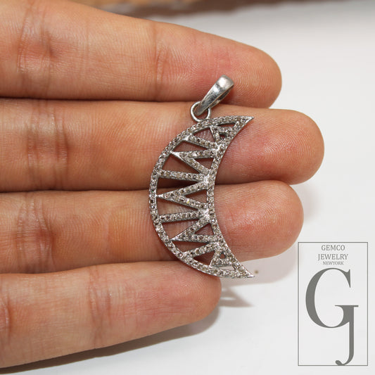 1pc Crescent Moon Pendant Designer Rosecut Pave Diamond Pendant Sterling 925 Silver Handmade Finish Diamond Charms Necklace Pendant