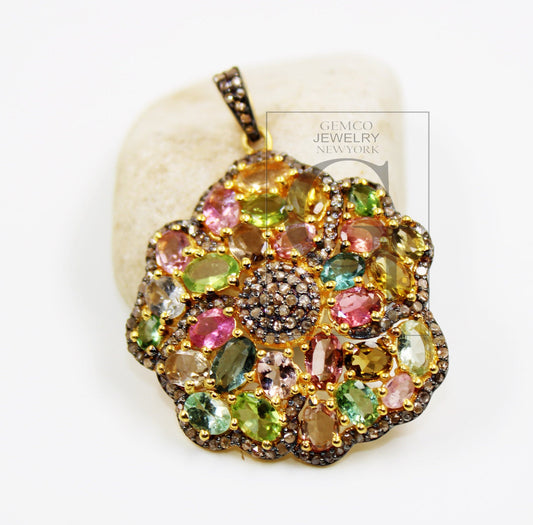 14k Gold Designer Tourmaline Stone Rose Cut Pave Diamond Pendant 925 Sterling Silver Handmade Finish Diamond Charms Necklace Pendant