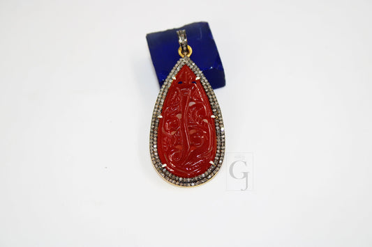 14k Gold Carving Red Onyx Stone Pendant Rosecut Pave Diamond Pendant 925 Sterling Silver Handmade Finish Diamond Charms Necklace Pendant