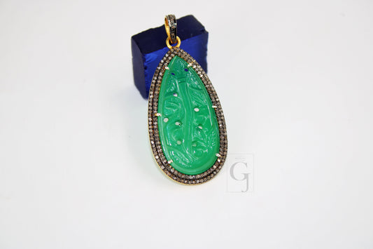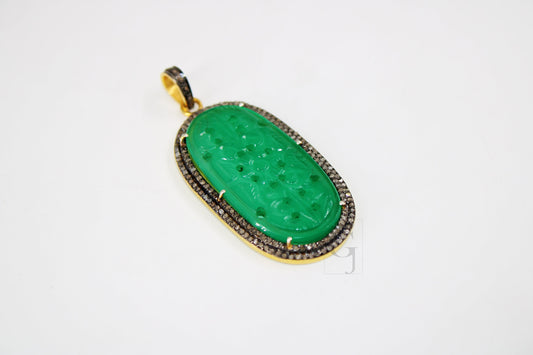 14k Gold Carving Green Onyx Stone Pendant Rosecut Pave Diamond Pendant 925 Sterling Silver Handmade Finish Diamond Charms Necklace Pendant