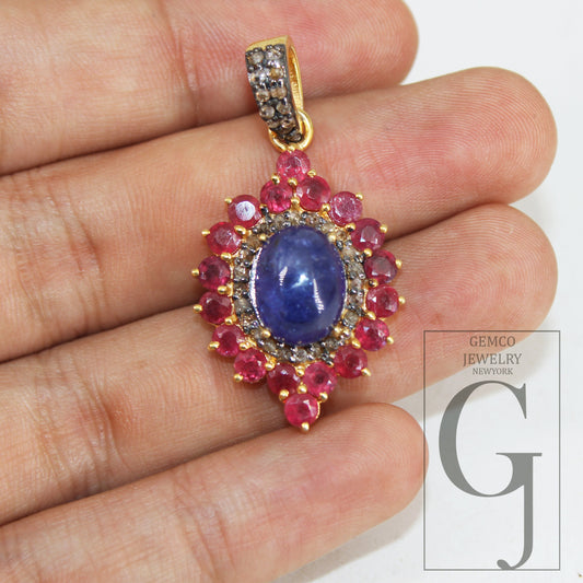 14k Finish Tanzanite And Ruby Pendant Designer Rosecut Pave Diamond Pendant Sterling 925 Silver Handmade Finish Diamond Necklace Pendant