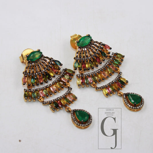 14k Gold Emerald Multi Tourmaline Earring Finish Designer Rosecut Pave Diamond Earring 925 Sterling Silver Handmade Silver Diamond Jewelry