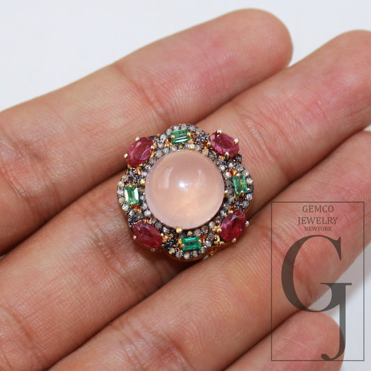 14k Gold Designer Rose Quartz Ring Ruby Emerald Ring Rosecut Pave Diamond Rings 925 Sterling Silver Handmade Silver Finish Diamond Jewelry