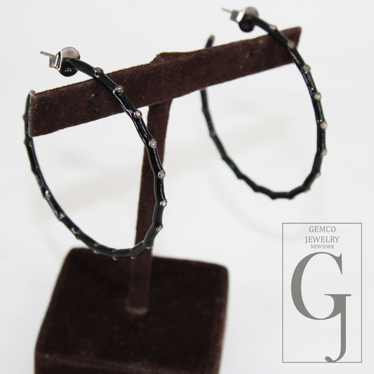 Black Enamel Hoop Earring Designer Hoop Earring Rosecut Pave Diamond Earring 925 Sterling Silver Handmade Silver Finish Diamond Boho Earring