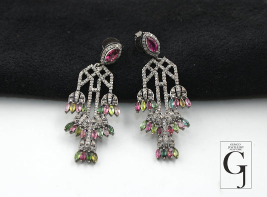 Fashionable real multi coloured tourmaline stone designer earring Rosecut pave diamond 925 sterling silver finish handmade diamond earring