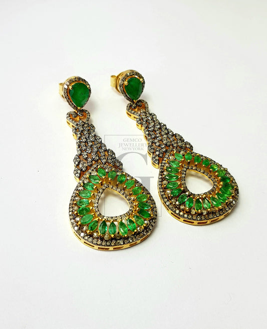 Fashionable natural AAA quality emerald vermail gold designer earring, Rosecut pave diamond 925 sterling silver handmade diamond earring