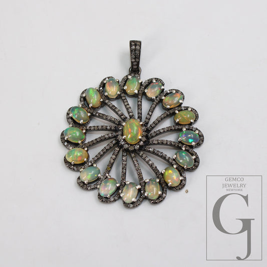 Fired opal designer pendant Rosecut pave diamond pendant 925 sterling silver handmade finish diamond charms necklace pendant