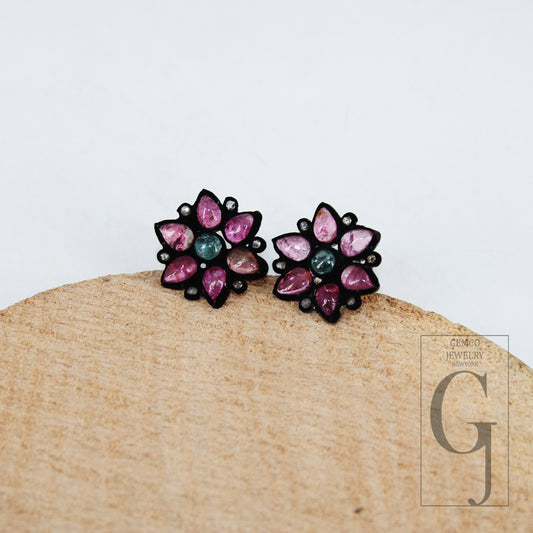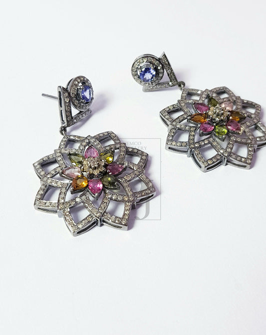 Flower style multi color tourmaline designer Rosecut pave diamond earrings 925 sterling silver handmade silver finish diamond earrings
