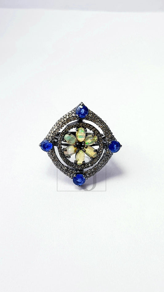 Floral designe Rosecut pave diamond ring 925 sterling silver handmade silver diamond ring, Ehopian opal kyanite stone diamond beautiful ring