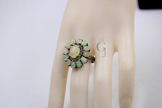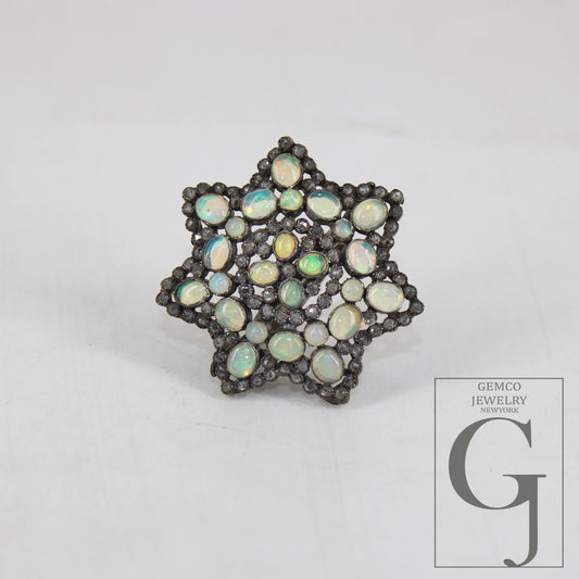 Flower look oxidized finish natural opal ring designer Rosecut pave diamond rings 925 sterling silver handmade silver finish diamond ring