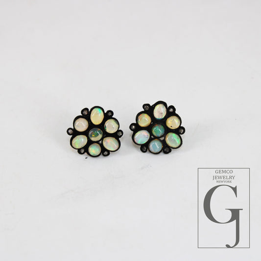 Flower Design Fire Opal Earring Pave Rosecut Diamond 925 Sterling Silver Handmade Beautiful Studs Latest Design Diamond Pave Stud Earrings