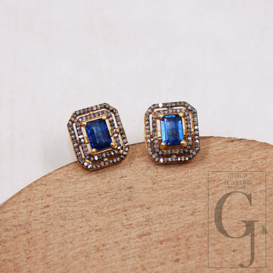 Gold Antique Finsih Beautiful Kyanite Stud Earrings Tops Pave Rosecut Diamond 925 Sterling Silver Handmade Diamond Pave Stud Earring Jewelry