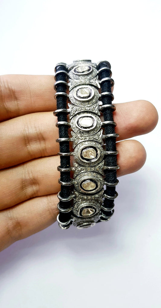 Flat Diamond Design Pave Rosecut Diamond 925 Sterling Silver Handmade Thread Diamond Bracelet Bangle