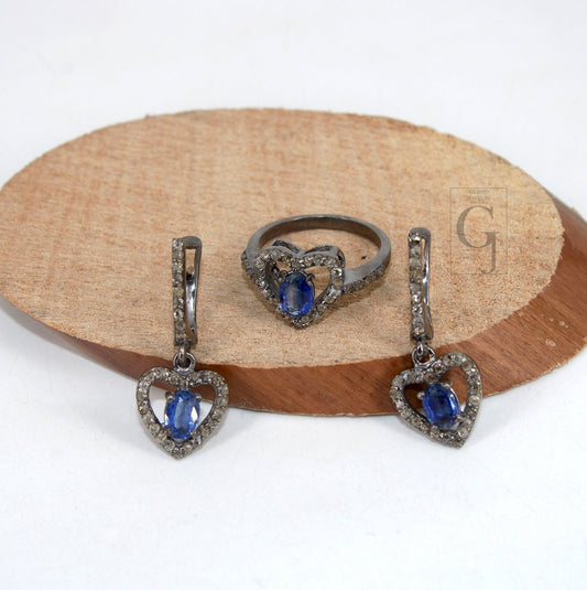 Heart shape oxidized finish kyanite ring earring jewelry set designer Rosecut pave diamond 925 sterling silver handmade silver diamond ring