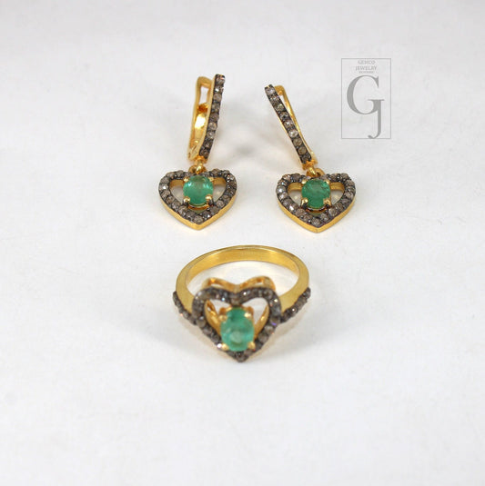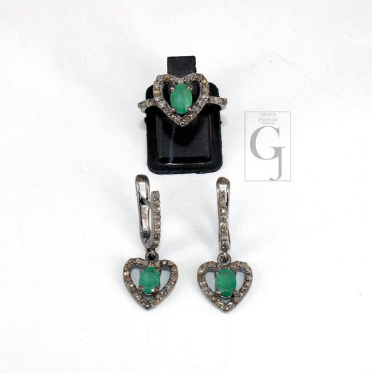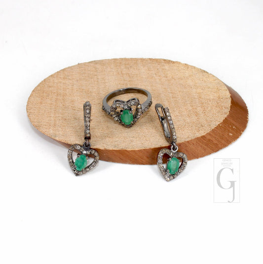 Heart shape oxidized finish emerald ring earring jewelry set designer Rosecut pave diamond 925 sterling silver handmade silver diamond ring