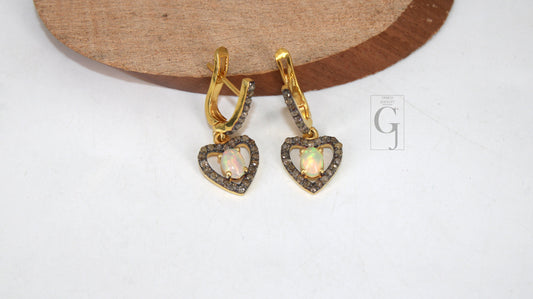 Heart Shape 14k Gold Finish Fire Opal Ring Earring Jewelry Set Designer Rosecut Pave Diamond 925 Sterling Silver Handmade Diamond Opal Ring