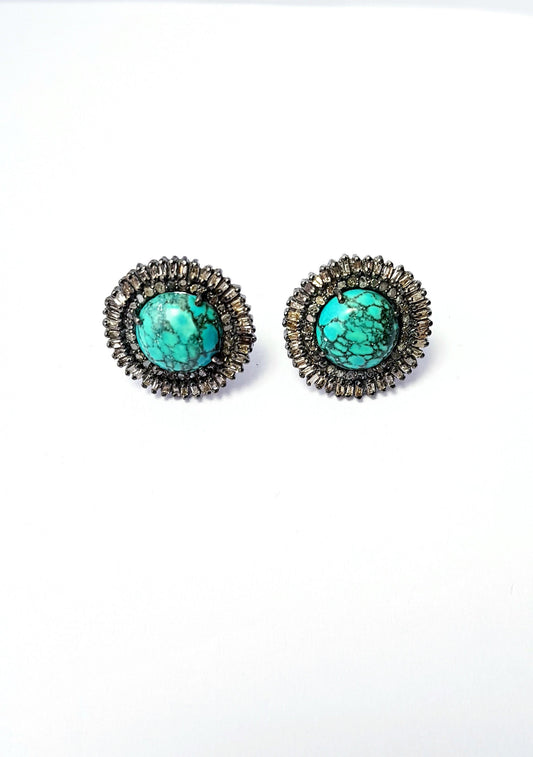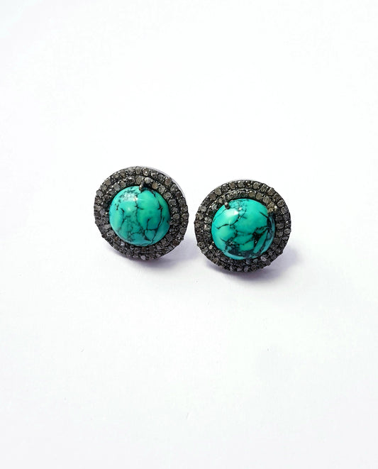 Latest Designer Rosecut Pave Diamond Stud Earrings 925 Sterling Silver Handmade Silver Finish Turquoise Diamond Stud Earrings