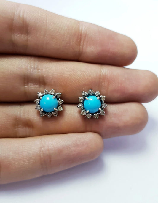 Latest designer Rosecut pave diamond stud earrings 925 sterling silver handmade silver finish turquoise beautiful diamond stud earring