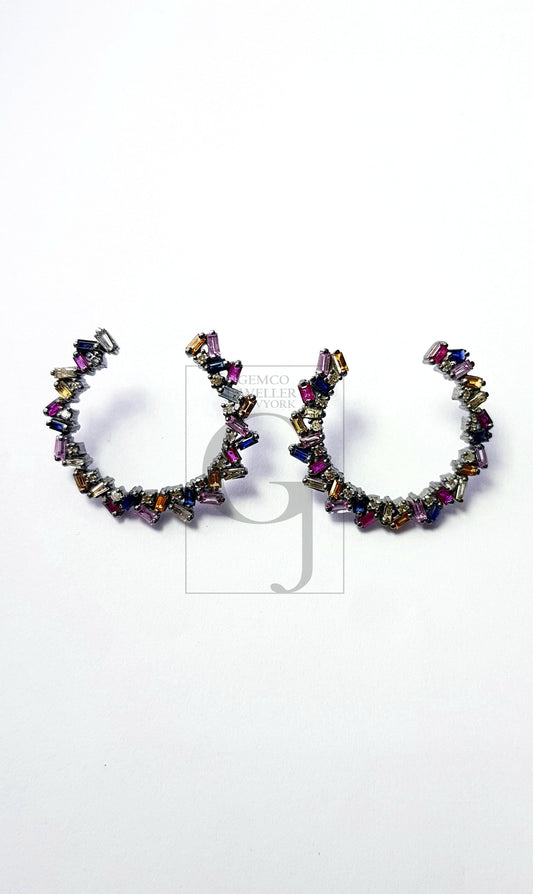 Natural multi colored sapphire stone baguettes hoop style rosecut pave setting diamond sterling silver earring ,antique look hoop earring