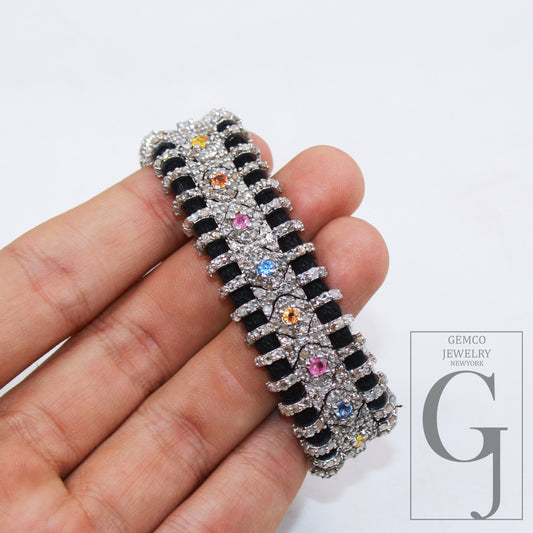 Natural Multi Sapphire Design Thread Bracelet Rosecut Pave Diamond Thread Bangle Bracelet Sterling Silver Handmade Finish Bracelet Jewelry