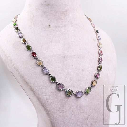 Natural Multi Tourmaline Diamond Necklace Rosecut Pave Diamond Jewelry Sterling Silver Handmade Jewelry Adjustable Necklace Pendant Jewelry