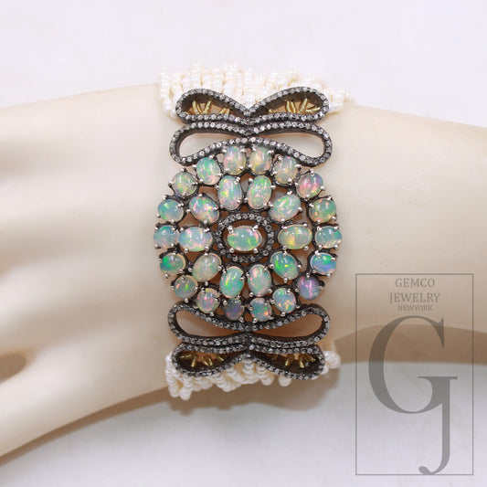Natural Opal Bracelet Designer Rosecut Pave Diamond Bracelet 925 Sterling Silver Handmade Finish Opal And Pearl Diamond Bracelet Jewelry