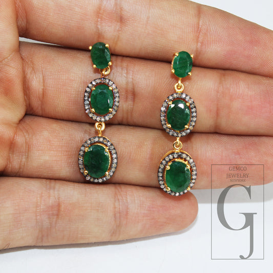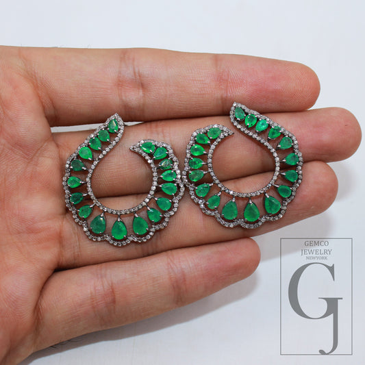 Natural Emerald Pave Diamond Earring 925 Sterling Silver Handmade Pave Diamond Earring Zambian Emerald Stone Jewelry Wedding Jewelry