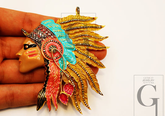 One of a kind enameling design Indian chief pendant designer Rosecut pave diamond pendant handmade finish diamond necklace pendant