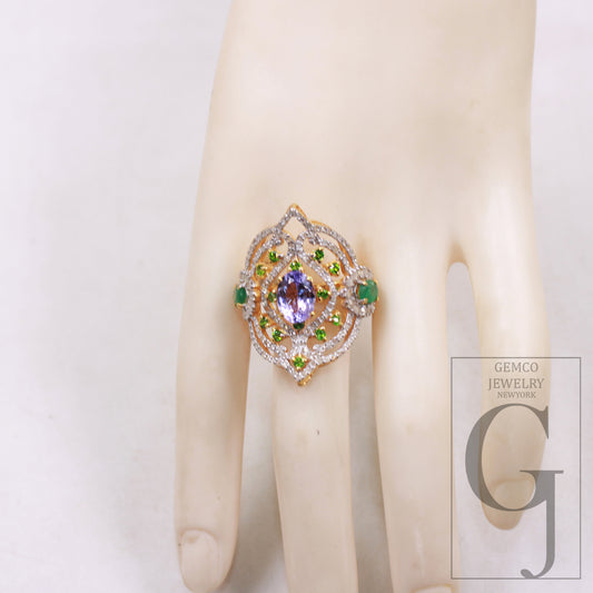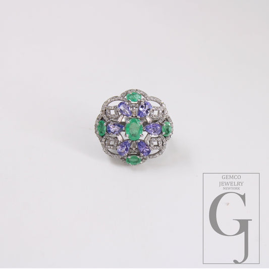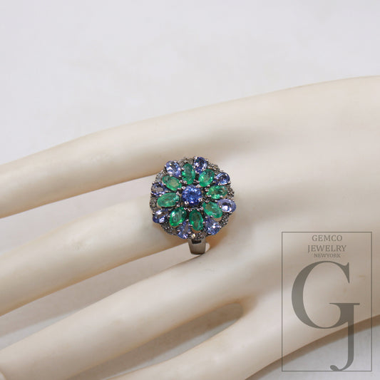 One of a Kind Designer Emerald, Tanzanite Ring Designer Rosecut Pave Diamond Rings 925 Sterling Silver Handmade Silver Finish Diamond Ring