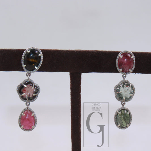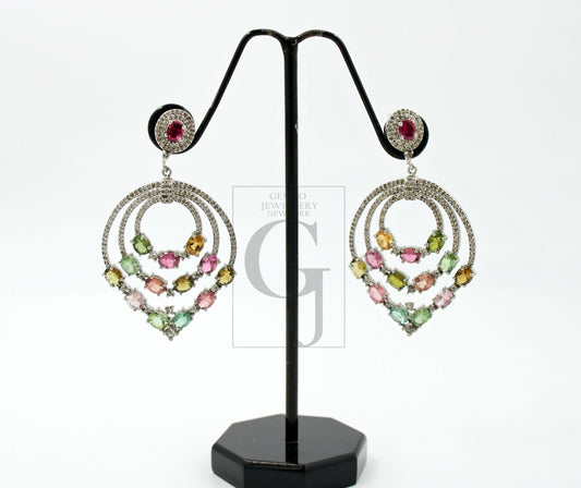 One Of a Kind Multi Tourmaline Designer Rosecut Pave Diamond Earrings 925 Sterling Silver Handmade Silver Finish Diamond Earrings Jewelry
