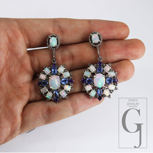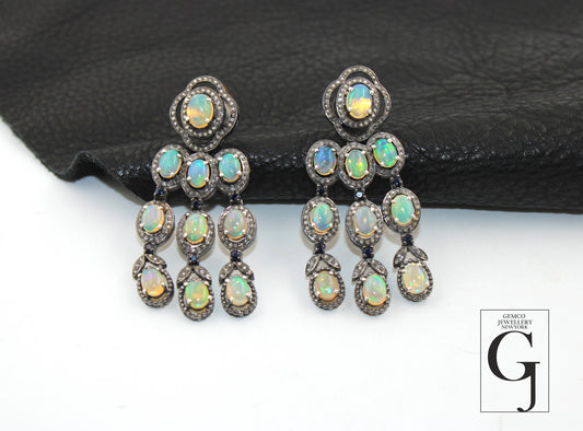 One Of A Kind Opal Earring Designer Earring Rosecut Pave Diamond Earrings 925 Sterling Silver Handmade Silver Finish Diamond Earring