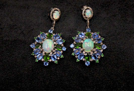 One of a kind sapphire and tourmaline designer Rosecut pave diamond earrings 925 sterling silver handmade silver finish diamond earrings