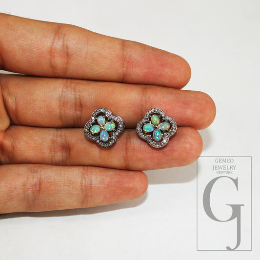 Oxidized Finish Ethiopian Opal Flower Designer Earring Studs Pave Rosecut Diamond 925 Sterling Silver Handmade Diamond Pave Stud EarringsRegular price $58.80 USDRegular priceUnit price per$120.00 USDSale price $58.80 USDSale