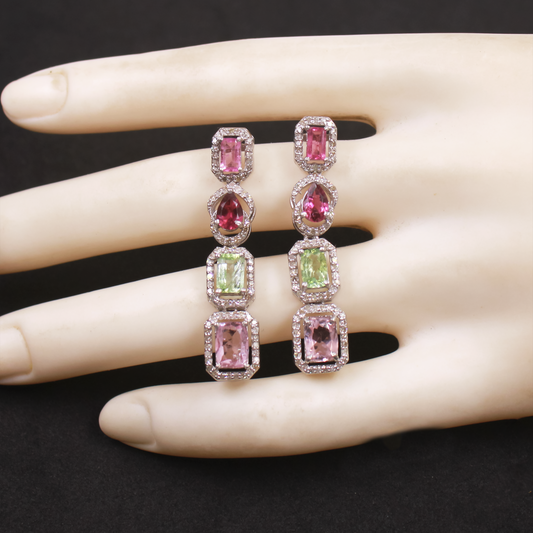 Natural Multi Tourmaline Drop Earrings With Rosecut Pave Diamonds In 925 Sterling Silver Handmade Finish Artisan Jewelry