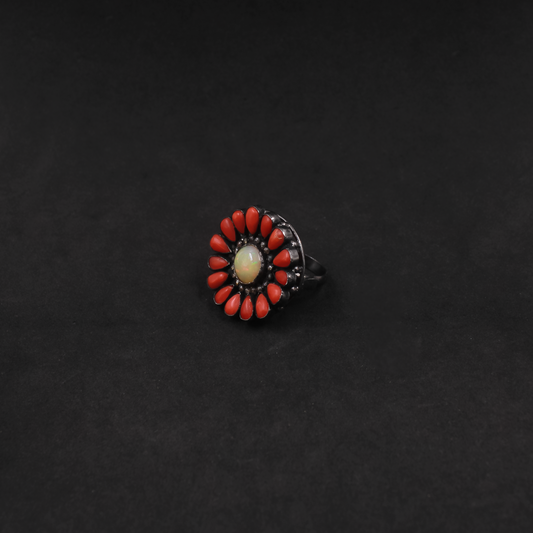 Natural Ethiopian Opal & Red Coral Ring With Pave Diamonds In 925 Sterling Silver, Handmade Collector’s Artistic Jewelry