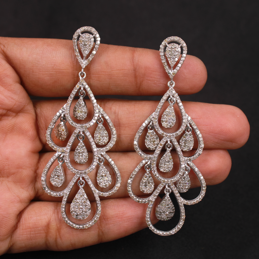 Natural Pave Diamond Dangle Earrings – Handmade 925 Sterling Silver Drop Jewelry, Luxury Wedding Gift for Her