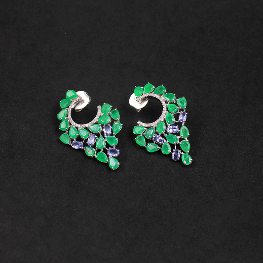 Natural Emerald And Tanzanite Earrings With Rosecut Diamonds – 925 Sterling Silver Handmade Jewelry