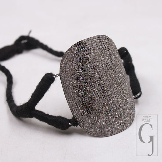 Handmade Antique Finish Sterling Silver Bracelet With Rose Cut Diamonds – Black Thread Adjustable Bangle, Pave Set, Boho Luxury Jewelry